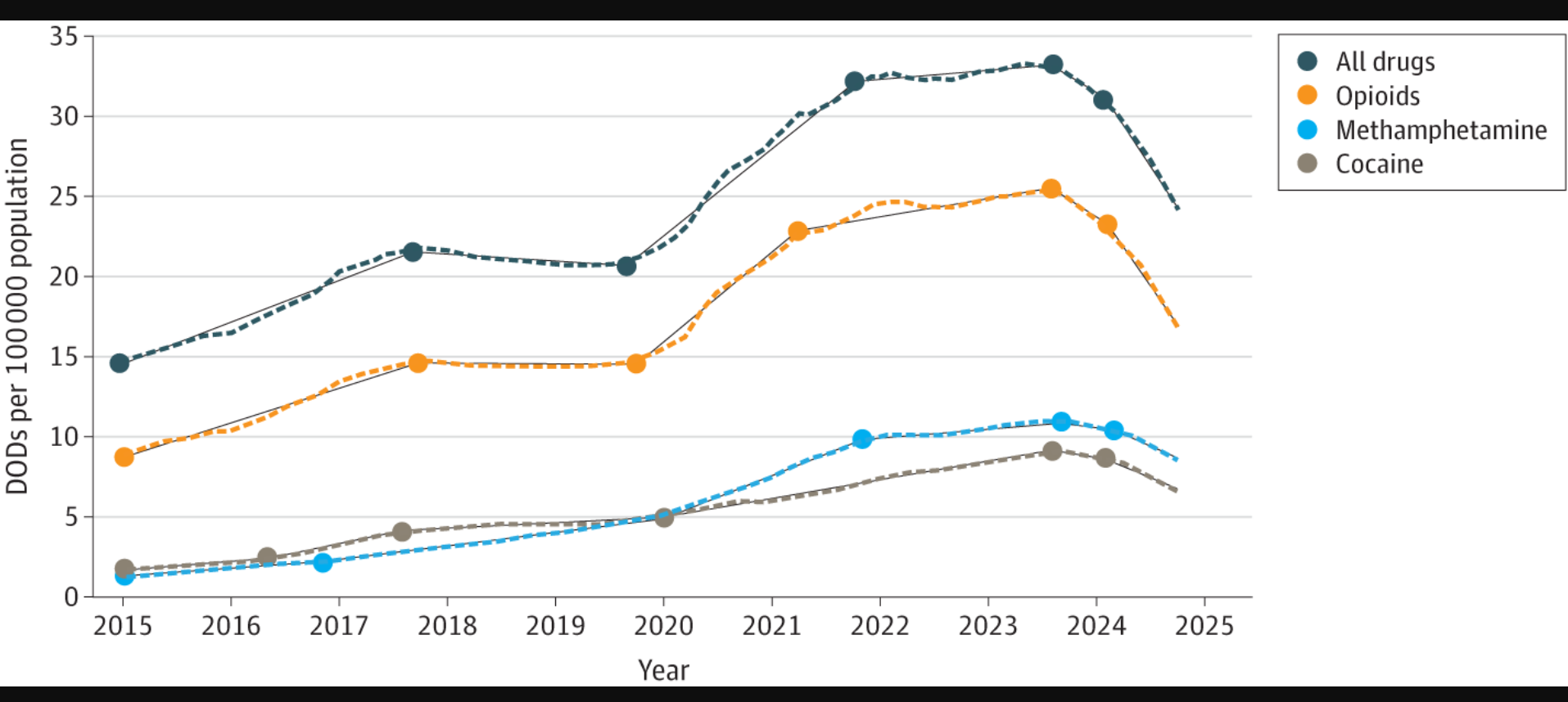 The chart originated in a report (archived here) published in the Journal of the American Medical Association (JAMA) titled "Decline in US Drug Overdose Deaths by Region, Substance, and Demographics" published online on June 12, 2025. Researchers were addressing the question "When did US drug overdose deaths (DODs) begin to decelerate, and was that decline uniform across substances and demographics?"
