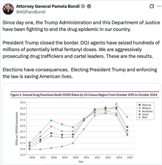 U.S. Attorney General Pam Bondi also misrepresented the drug overdose chart when she posted it on her X account on December 30, 2025, suggesting that the decline was the result of the Trump administration "aggressively prosecuting drug traffickers and cartel leaders." She deleted her post soon after it was called into question.