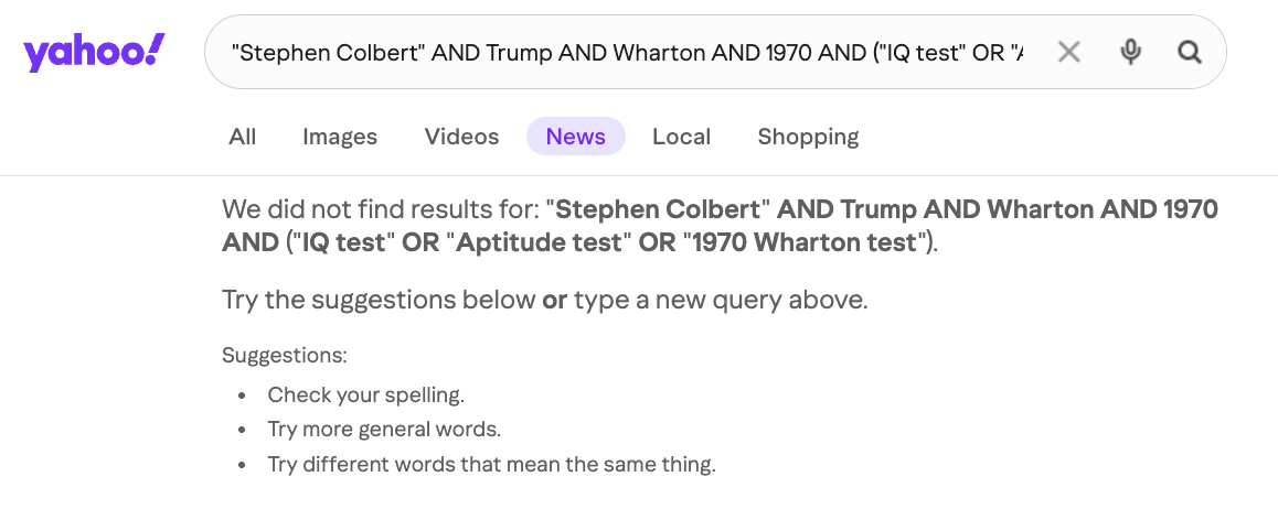 Did Stephen Colbert "reveal" Donald Trump's "1970 Wharton IQ test"? No, that's not true: This claim and its variations originated from accounts that warned their audiences that they do not post factually accurate content. The rumor spread in variations that contradicted each other on the name of the TV host, school, test type and even the name of the person who supposedly took it. Lead Stories found no evidence that any of the versions was ever true.