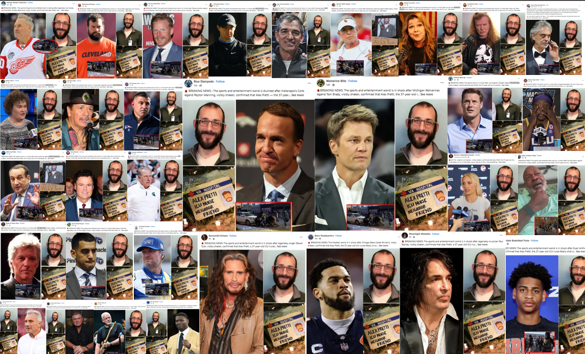 A search on Facebook for posts with the words "pretti nurse who was fatally shot was a member of his family" (archived here) brought up the nearly identical false story told about at least 36 celebrities. The list of sports stars, actors, and musicians include: