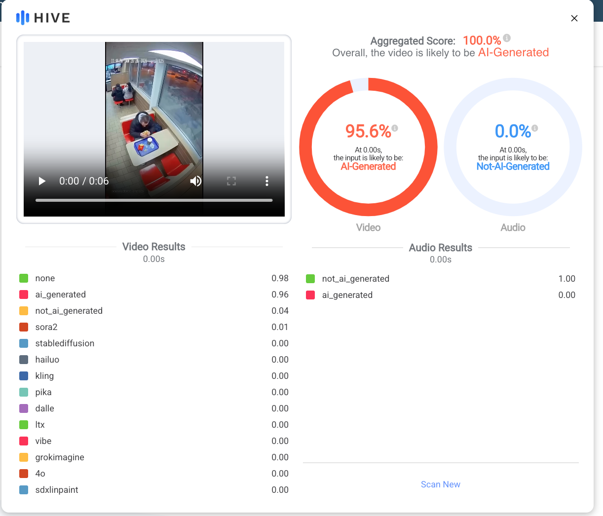 Lead Stories uploaded the video to the Hive Moderation AI-generated content detection tool, which returned a decisive verdict. It scored that it was 95.6% likely to be AI-generated content, as this screenshot shows: