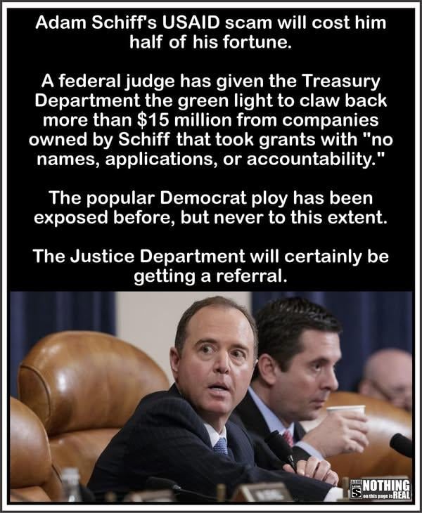 Adam Schiff's USAID scam will cost him half of his fortune. A federal judge has given the Treasury Department the green light to claw back more than $15 million from companies owned by Schiff that took grants with "no names, applications, or accountability." The popular Democrat ploy has been exposed before, but never to this extent. The Justice Department will certainly be getting a referral.