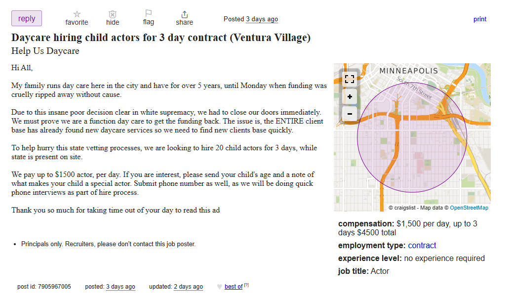 Does a viral Craigslist post prove that owners of a Minnesota daycare accused of fraud attempted to hire child actors to imitate legitimate operations? No, that's lacking enough evidence to prove it's true: Anyone could have published an anonymous post on Craigslist. The scenario - a day care center spending $90,000 on actors, doesn't appear to be likely due to inconsistencies.