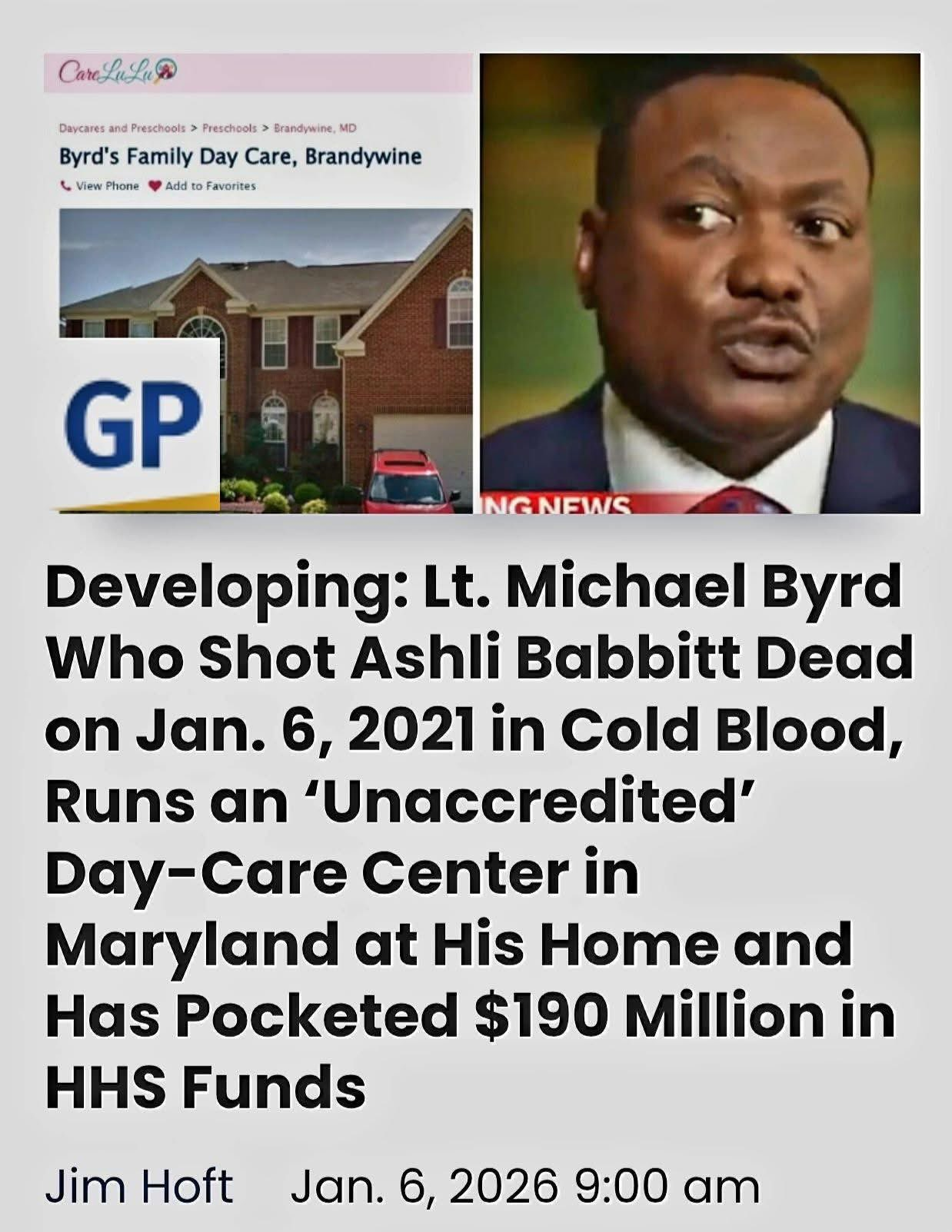 The image in thas post showed a headline that read "Developing: Lt. Michael Byrd Who Shot Ashli Babbitt Dead on Jan. 6, 2021 in Cold Blood, Runs an 'Unaccredited' Day-Care Center in Maryland at His Home and Has Pocketed $190 Million in HHS Funds":