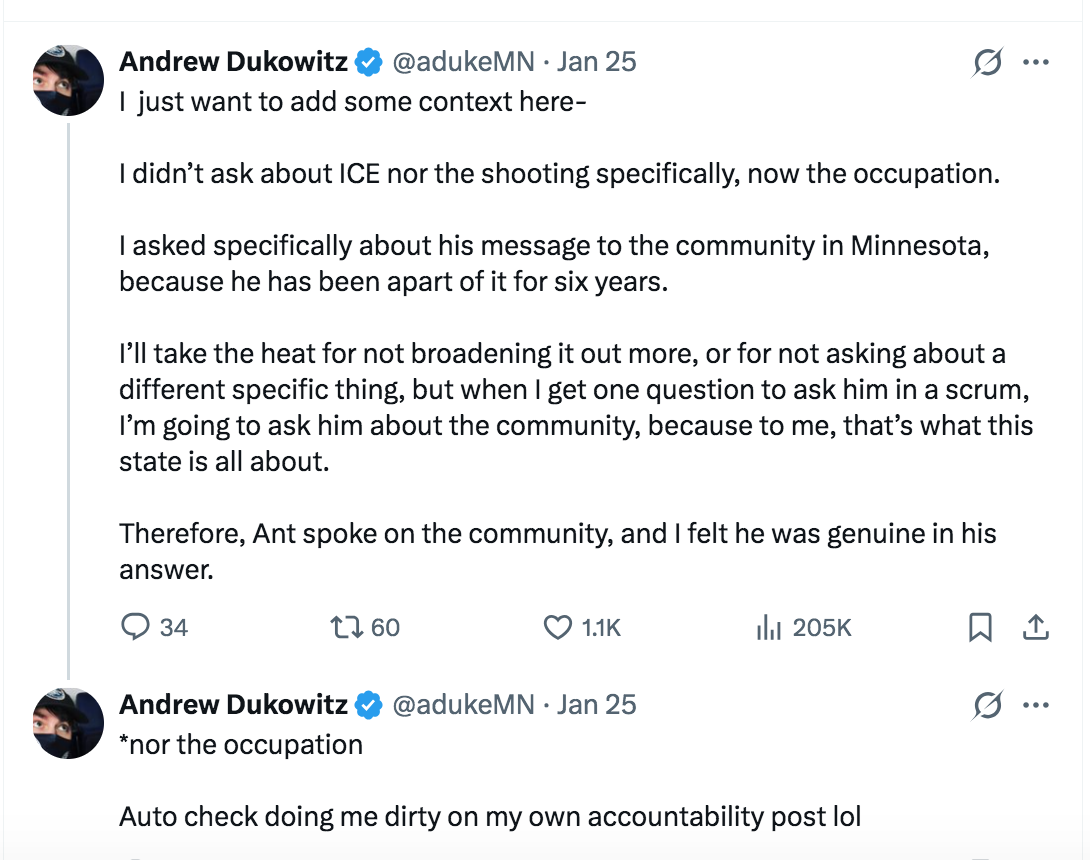 Andrew Dukowitz, the reporter who asked Edwards the question, posted on his X account to clarify what he asked and why he didn't address ICE or the shootings in the state: