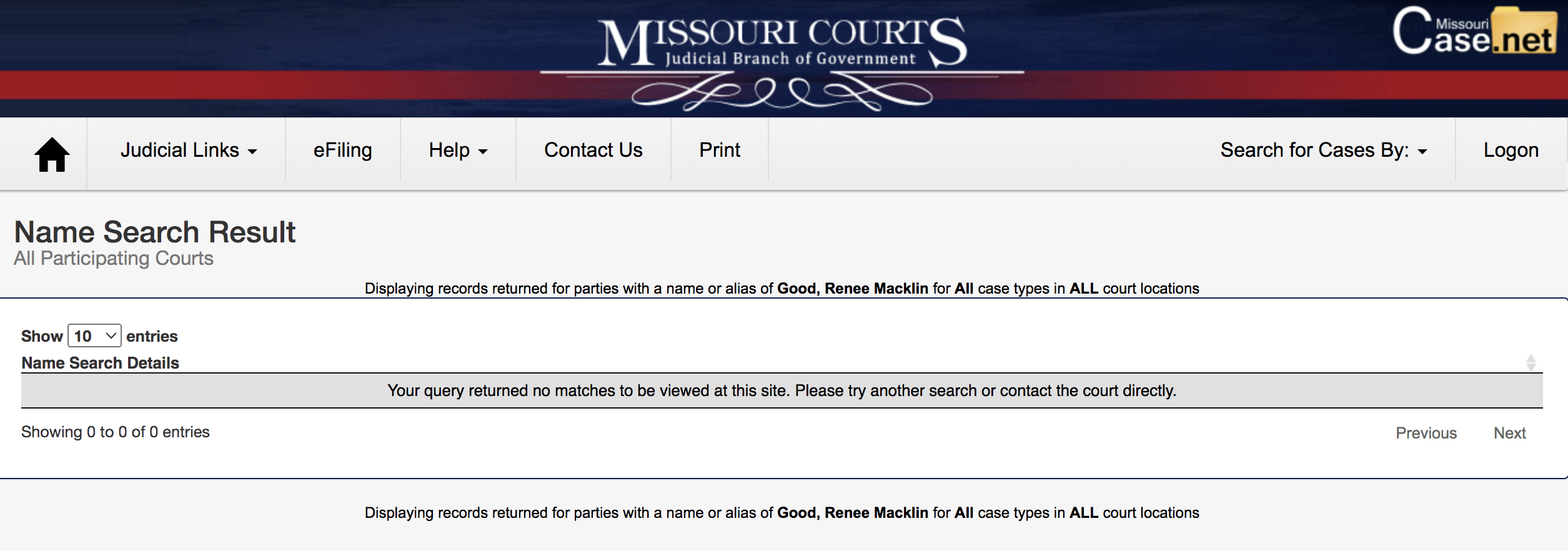 The person refers only to "the court" but does not specify which court and provides no court documents or public records to support the claim. Lead Stories searched for court records of Renee Macklin Good in Missouri and did not find any cases at all involving her, as this screenshot shows: