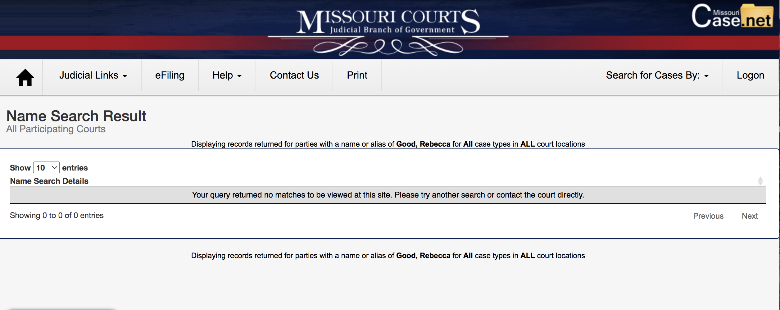 Lead Stories searched for court records of Rebecca Good in Missouri and did not find any cases at all involving her, as this screenshot shows: