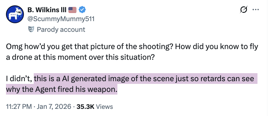 The full watermark seen in the claim reviewed in this fact check led to a January 7, 2026, post (archived here) by a social media user labeled as a "parody account" (archived here) who published the image first.