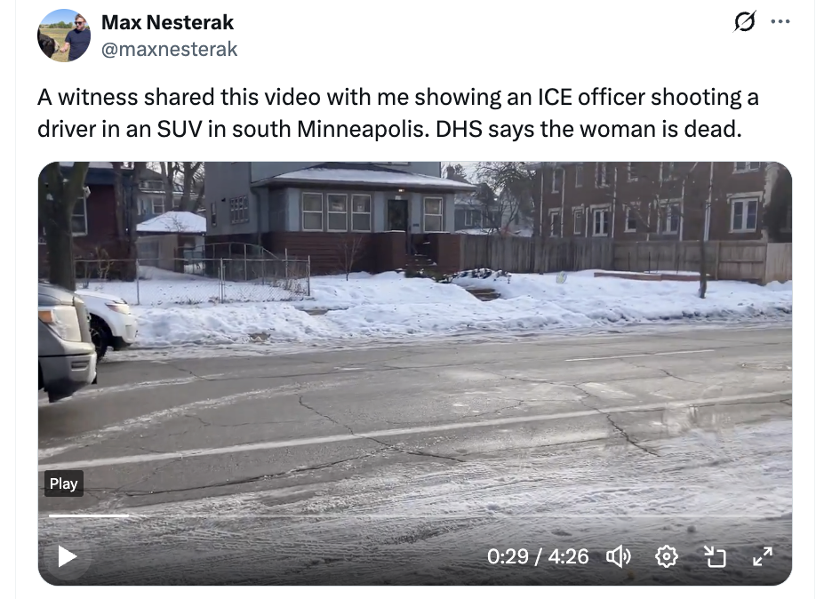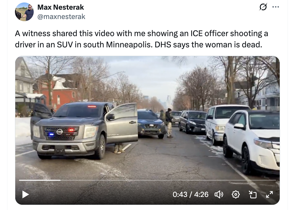 The still image, however, did not document the moment when Renee Good, 37, was shot to death in Minneapolis, Minnesota, on January 7, 2026.