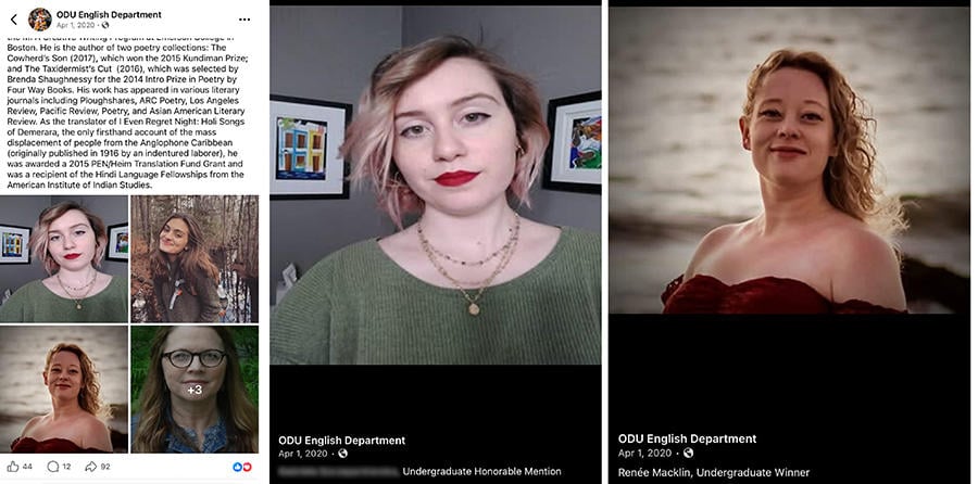 On April 1, 2020 the Old Dominion University English Department made a lengthy post (archived here) on Facebook announcing the 2020 ODU College poetry prizes. Included in this post (pictured below left) were individual portrait photos of the five prize winners and the judge. When these photos are opened individually, they are captioned with the name of the person and the award. Lead Stories reached out to the woman named in the photo (below center). She confirmed that it is her and asked to not be named in this article. The photo on the right is captioned: