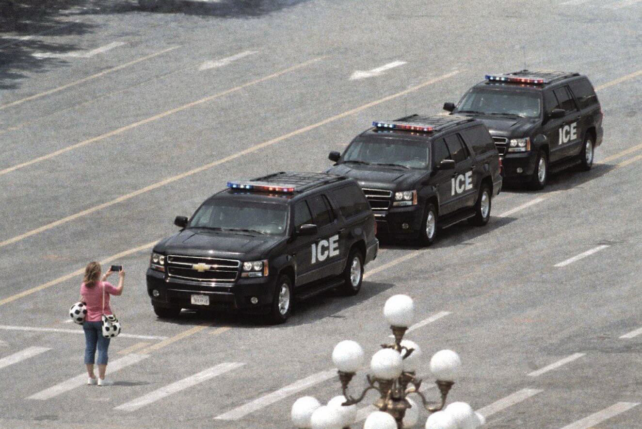 Is this viral image a real photo of a woman in a pink shirt carrying black-and-white bags standing in front of three black SUVs marked 'ICE' while holding up a phone? No, that's not true: The image is a digital edit made to resemble a famous historical picture known as "Tank Man". That picture showed a man carrying shopping bags standing in front of a column of tanks in China in 1989.