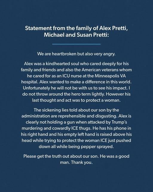 The sickening lies told about our son by the administration are reprehensible and disgusting. Alex is clearly not holding a gun when attacked by Trump's murdering and cowardly ICE thugs. He has his phone in his right hand and his empty left hand is raised above his head while trying to protect the woman ICE just pushed down all while being pepper sprayed.