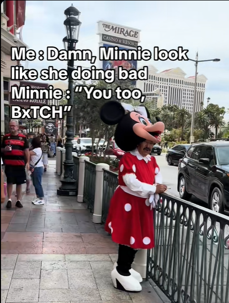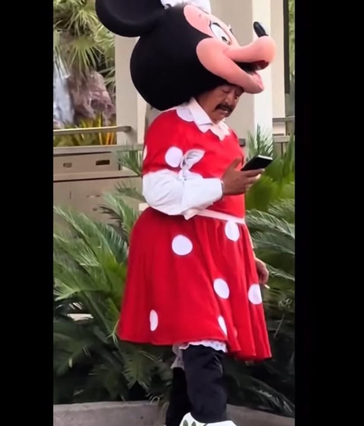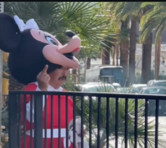 Several videos show the man with the Minnie head piece off in confrontational exchanges with tourists, including with him making obscene gestures or comments.