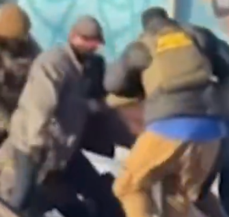 The full video is 39 seconds long. This X post slows down and rewinds a segment about 15 seconds into the video, showing an agent wearing a gray coat who bends down and reaches toward the man on the ground with his right hand: