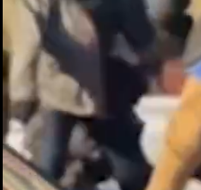 At :21, just as first shot is fired, the man in gray coat quickly turns his head toward the scuffle.