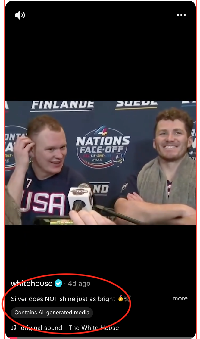 Did the White House post on TikTok a real video showing USA men's hockey player Brady Tkachuk insulting Canada, calling them "maple syrup eating f***s"? No, that's not true: The clip of Tkachuk bad-mouthing Canada after the USA men's team won the gold medal in the Olympics is AI-generated audio. Tkachuk plays for the Ottawa Senators NHL team and said the clip is "clearly fake" and that it isn't his voice making the rude remark. The White House TikTok account tagged the post as AI-generated but other social media accounts did not.