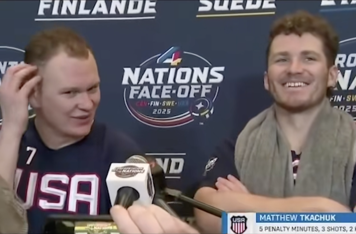 The footage opens with a clip from Brady and his brother Matthew Tkachuk's press conference at the 4 Nations Face-Off game in February 2025, as the signage behind them shows. Substitute over the authentic audio is an AI-generated voice saying, "They booed our anthem so I had to teach those maple syrup eating f***s a lesson," while the song "Free Bird" plays. This clip was posted on the YouTube account @RealQuotesAI in February 2025.