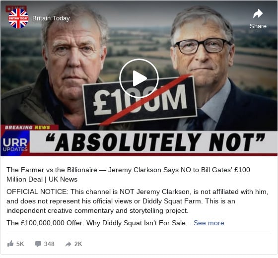 Is a video of Jeremy Clarkson talking about refusing a "£100 million deal" from Bill Gates to buy his Diddly Squat farm real? No, that's not true: The social media post in which the video appeared came with a lengthy disclaimer largely hidden below a "See more" link. Clarkson also left a comment under a now deleted post that appeared to be making the claim saying that it was "bollocks".