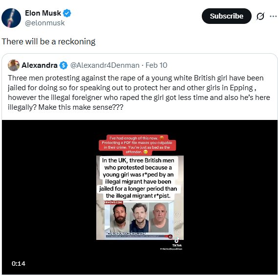 On February 11, 2026, the same video was shared (archived here) by Elon Musk on X. This is what it looked like at the time of writing: