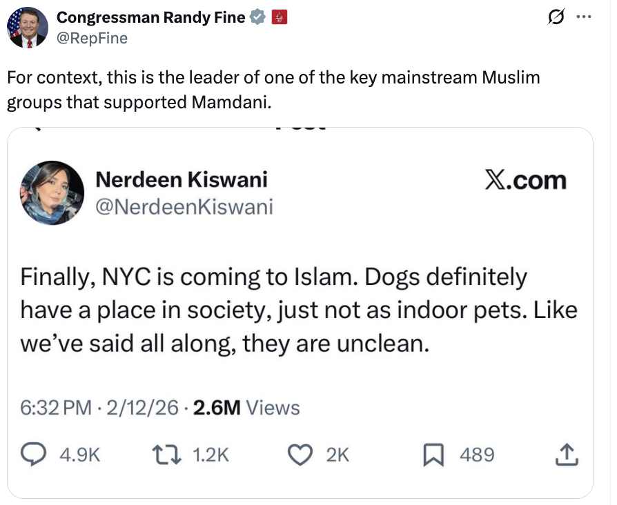 Did Congressman Randy Fine write on social media that "the choice between dogs and Muslims is not a difficult one"? Yes, that's true: These words appeared on his official account on X. That account is linked to his congressional page.