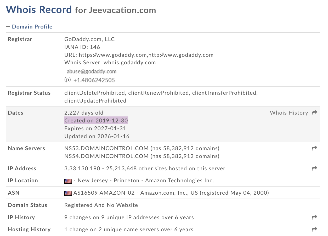 (Image source: Lead Stories screenshot of page at whois.domaintools.com/jeevacation.com)