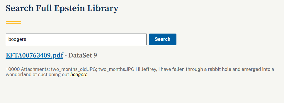 A search for "boogers" produced one result:
