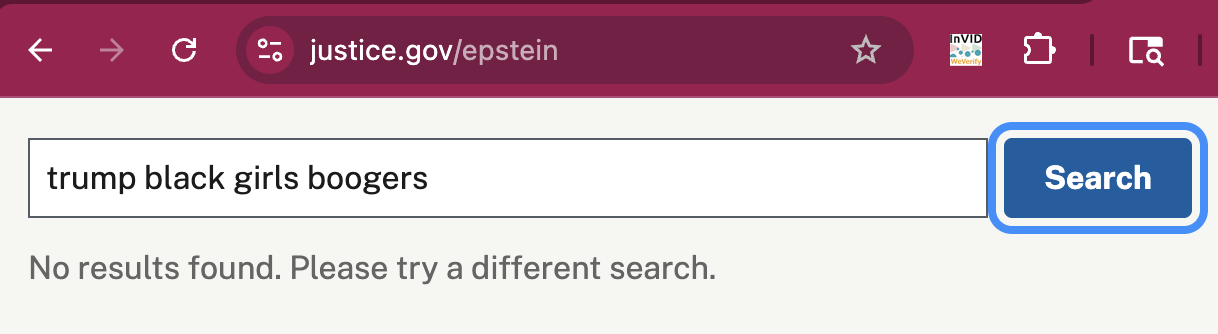 Does a viral image on social media prove that Justice Department files show Jeffrey Epstein once wrote that Donald Trump calls "black girls" "boogers"? No, that's not true: Multiple searches across the Department of Justice website did not show such an email. The viral screenshot is unlikely to be authentic because it contains a reference to a domain registered months after Epstein's death.