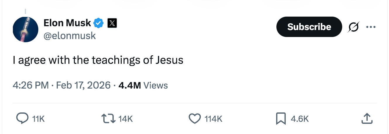 While the author of the post was clearly questioning Musk's commitment to the "teachings of Jesus," the screenshot of Musk's post does show a real post. The image in the post uses a real tweet from Musk's X account @elonmusk (archived here) that he posted on February 17, 2026, as this screenshot shows: