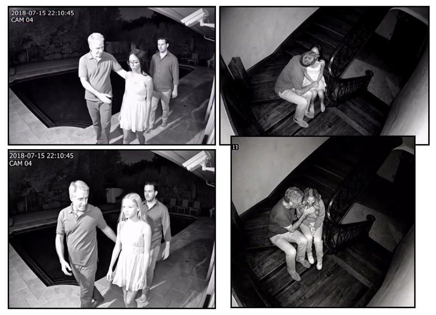 One video returned in the search was posted on Instagram on Feb. 18, 2026 by @epsteinfiles.69 (archived here). This video shows a nearly identical scene of two men escorting a girl along a poolside patio (compared below left). In the first case the girl character is brunette with glasses, in the next she is blonde. Although the fonts differ slightly, the times stamped in the upper left corners are identical, "2018-07-15 22:10:45 CAM 04". The timestamp seconds do not advance even though the clips are several seconds long. In both AI-generated videos there is a downward view of a staircase landing with the man making moves on the girl.