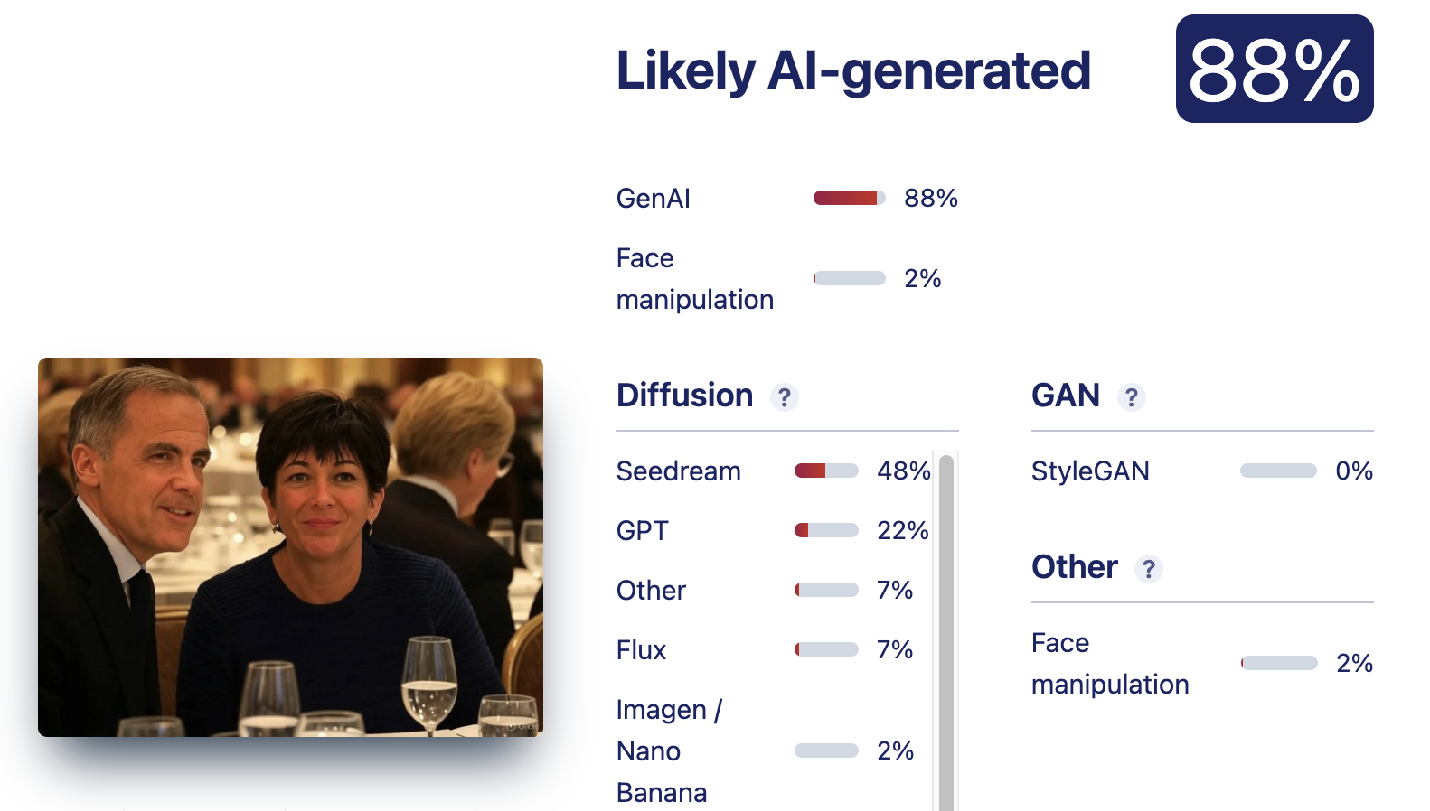 This was not the first AI-generated image used to spread the narrative about the supposed ties between Carney and Epstein. Earlier, Lead Stories debunked another similar claim. Lead Stories couldn't find images of the two together. However, in January 2025, the Toronto Sun (archived here) republished an August 2013 photo showing Maxwell standing between Carney and his wife in a public setting.