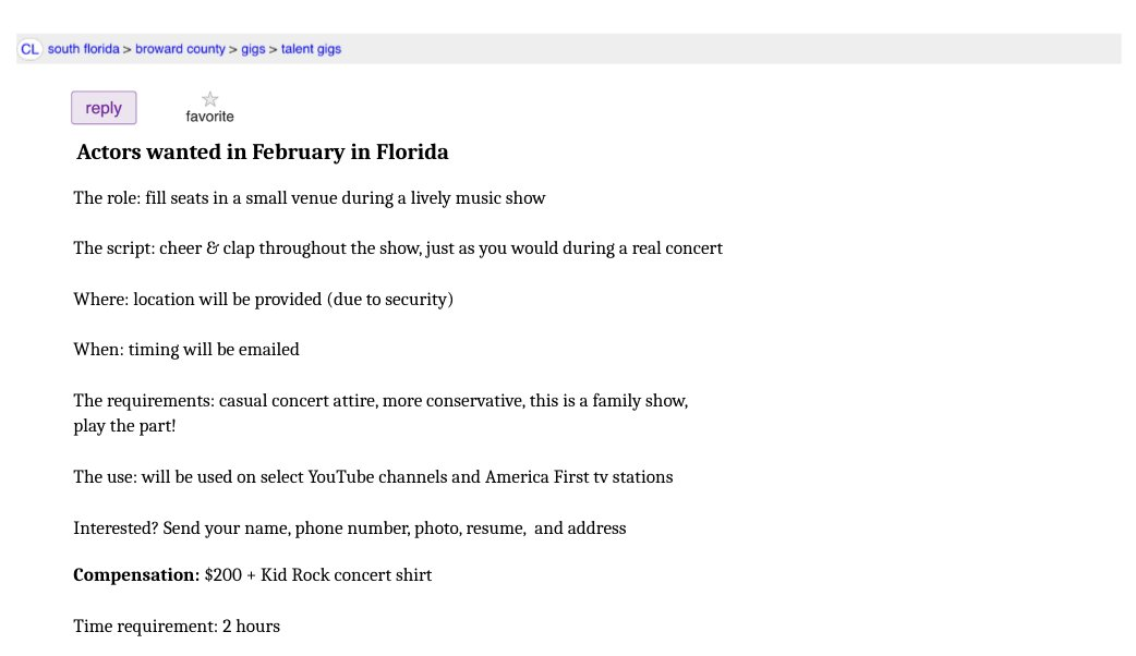 CL south florida > broward county > gigs > talent gigsActors wanted in February in FloridaThe role: fill seats in a small venue during a lively music showThe script: cheer & clap throughout the show, just as you would during a real concertWhere: location will be provided (due to security)When: timing will be emailedThe requirements: casual concert attire, more conservative, this is a family show, play the part!The use: will be used on select YouTube channels and America First tv stationsInterested? Send your name, phone number, photo, resume, and addressCompensation: $200 + Kid Rock concert shirtTime requirement: 2 hours.