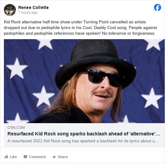 Kid Rock alternative half time show under Turning Point cancelled as artists dropped out due to pedophile lyrics in his Cool, Daddy Cool song. People against pedophiles and pedophile references have spoken! No tolerance or forgiveness.
