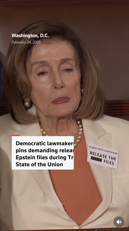 The image was a cropped screenshot from coverage of the State of the Union address (archived here) delivered by U.S. President Donald Trump on February 24, 2026. In the full recording (archived here) on the C-SPAN website, Pelosi appears at the 1:25:10 mark. As we see below, her badge says, "Release the ◼️ files":