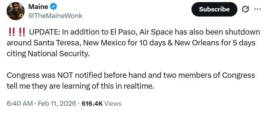 ‼️‼️ UPDATE: In addition to El Paso, Air Space has also been shutdown around Santa Teresa, New Mexico for 10 days & New Orleans for 5 days citing National Security.