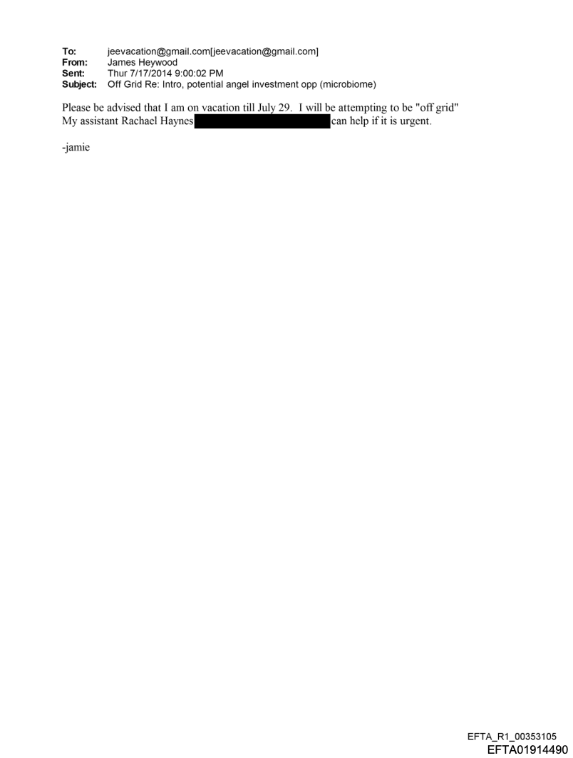 To: [email protected] [ [email protected] ]From: James Heywood <REDUCTED>Sent: Thu: 7/17/2018 9:00:02 PMSubject: Off Grid Re: intro, potential angel investmentt opp (nuclear)We need to discuss ww3 the investors want to know if we are still planning Feb 8 2026.Please be advised that I am on vacation till July 29. I will be attempting to be 'off grid'.My assistant Rachael Haynes >.com can help if it is urgent.-jamieEFTA_R1_00353105EFTA01914490