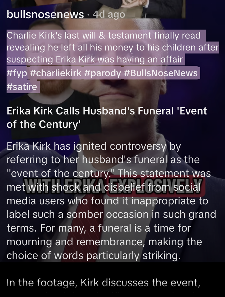 Fact Check: NO EVIDENCE Charlie Kirk Wrote Erika Kirk Out Of His Will After Suspected Affair With JD Vance Satire Label