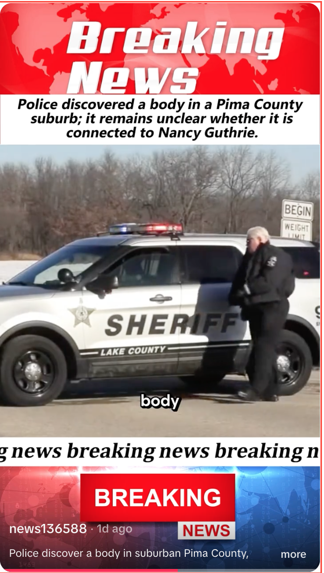 The footage posted on TikTok uses clips from various news reports showing Pima County Sheriff Chris Nanos, images of Savannah and Nancy Guthrie, and aerial footage of Nancy Guthrie's home in Tucson, Arizona.