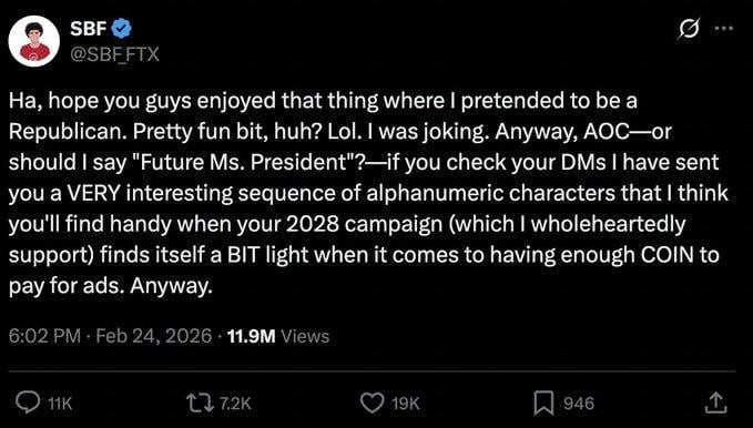 Lead Stories manually reviewed recent posts on Bankman-Fried's account on X and did not find any suggestions that he would be willing to donate specifically to U.S. Rep. Ocasio-Cortez (archived here) in 2026. Contrary to the claim reviewed in this article, Bankman-Fried wrote on February 20, 2026 (archived here):