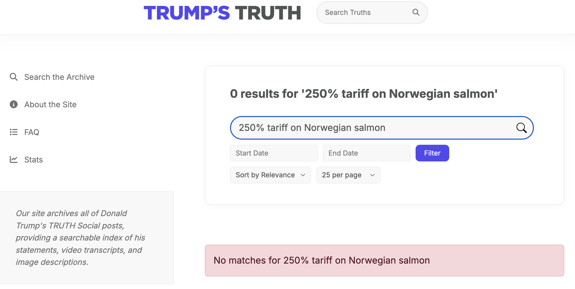 Lead Stories searched Trump's account on Truth Social (archived here) but did not find a single mention of "Norwegian salmon" (archived here).