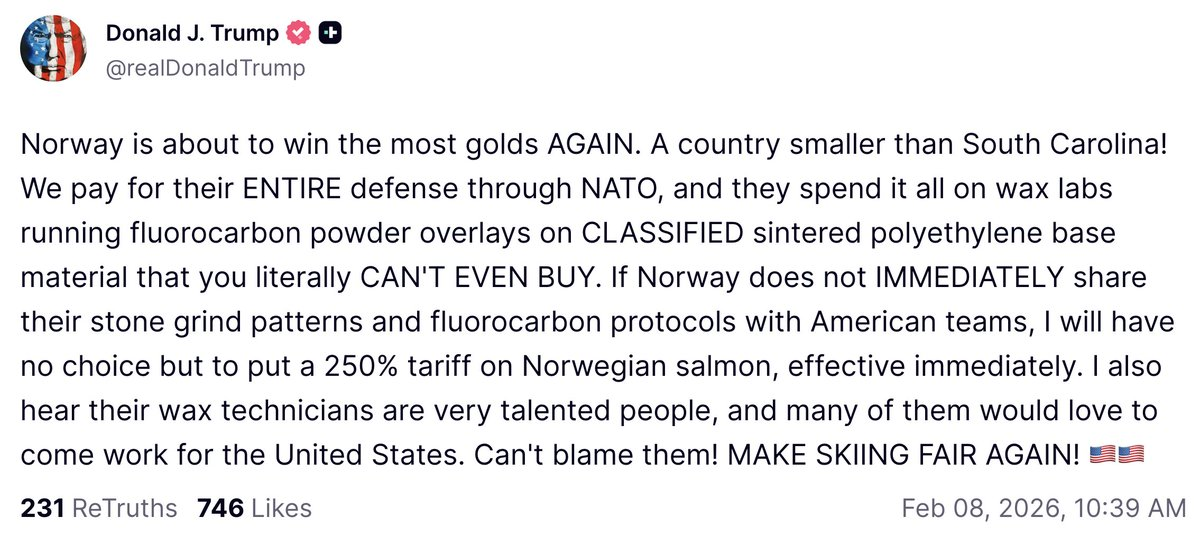 Norway is about to win the most golds AGAIN. A country smaller than South Carolina! We pay for their ENTIRE defense through NATO, and they spend it all on wax labs running fluorocarbon powder overlays on CLASSIFIED sintered polyethylene base material that you literally CAN'T EVEN BUY. If Norway does not IMMEDIATELY share their stone grind patterns and fluorocarbon protocols with American teams, I will have no choice but to put a 250% tariff on Norwegian salmon, effective immediately. I also hear their wax technicians are very talented people, and many of them would love to come work for the United States. Can't blame them! MAKE SKIING FAIR AGAIN!