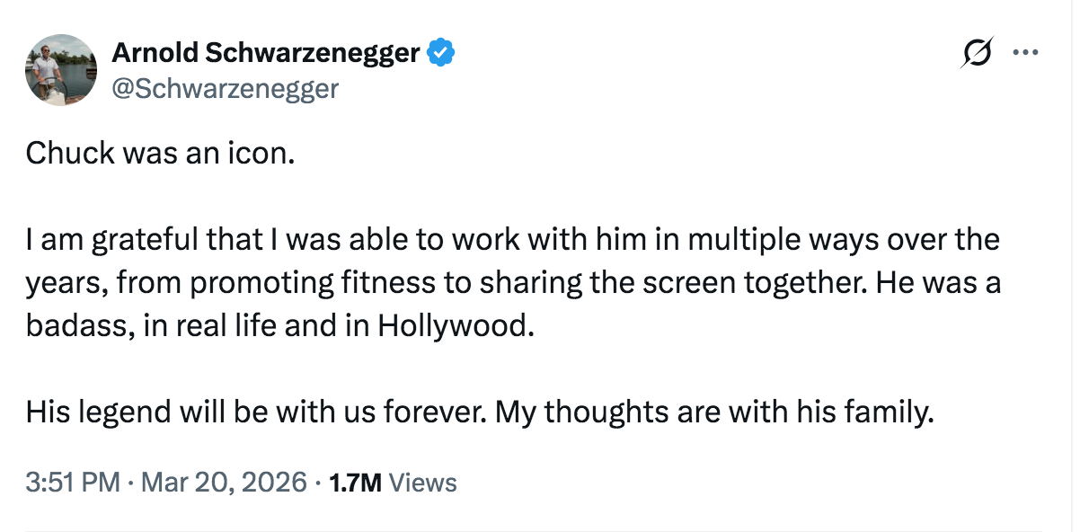 Schwarzenegger posted a message about Norris on his X account @Schwarzenegger on the same day, as this screenshot shows: