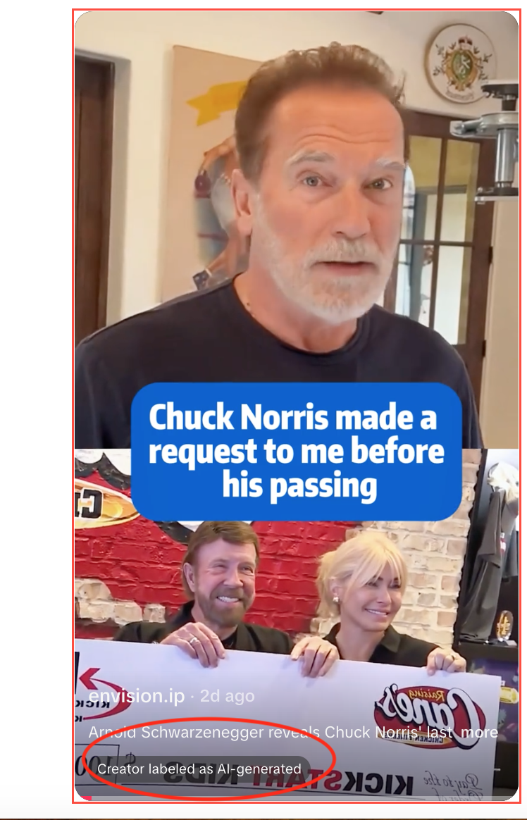 Did Arnold Schwarzenegger reveal Chuck Norris asked him before his passing to take care of his Kickstart Kids program? No, that's not true: The video is fake, Schwarzenegger's publicist told Lead Stories. The video is clearly labeled as AI-generated. No such video or announcement exists on any of Schwarzenegger's social media accounts or in legitimate news reports.