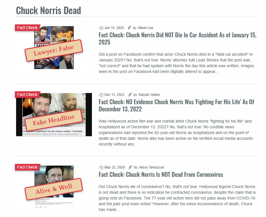 Over the years, social media posts claimed that Norris had passed away repeatedly on different dates, as documented by Lead Stories: