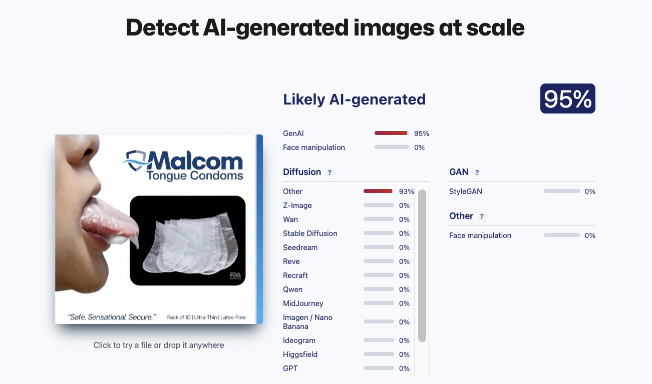 Lead Stories checked a screenshot from the video with one more AI detection tool, Sightengine. It placed the chances of the clip being AI-made at 95 percent: