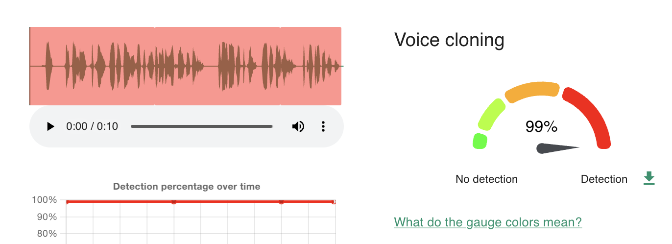 When the audio from the video was tested separately via InVid's Hiya tool, it concluded that the sound was 99 percent likely to have been artificially created: