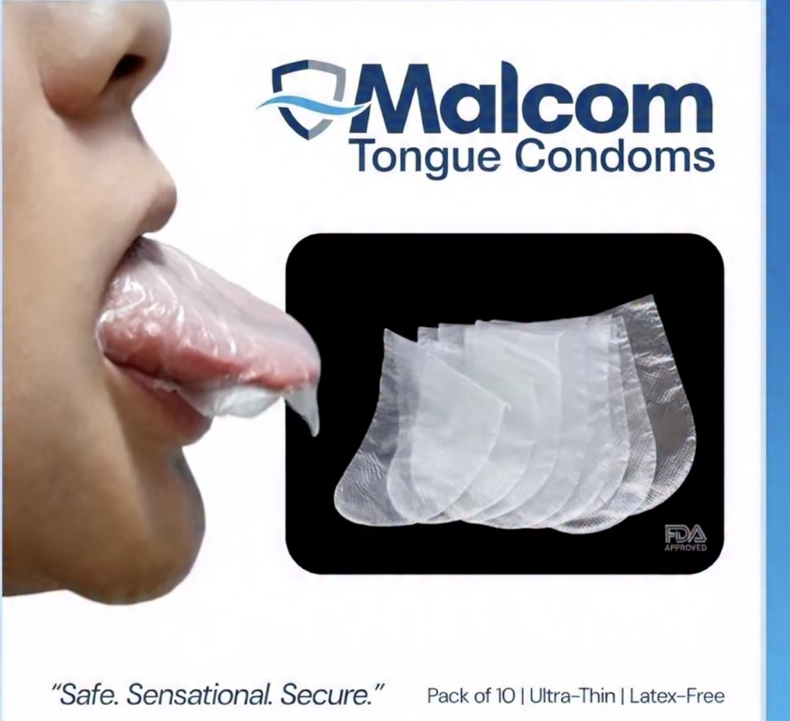 Check out this ad for tongue condoms. A thin sheet of protective material placed between the mouth and the intimate area. They help reduce the risk of transmission of various sexually transmitted infections. Have you ever seen one of these?