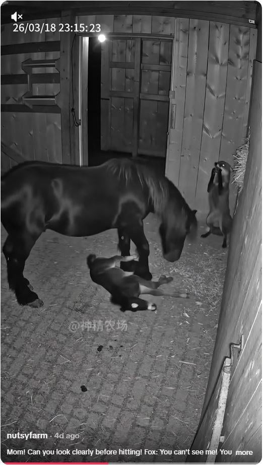 Later on March 25, 2026, @nutsyfarm uploaded another fake CCTV video showing a stable interior (archived here). The pseudo date stamp on this video, "26/03/18 23:15:12" is similar to the one in the donkey video, "26/03/16 23:22:12." In this AI-generated scenario the fox attacks the horse foal from behind just as with the donkey foal. The defending mare seems to become confused and repeatedly stomps at her own foal. The fox looks on from the corner, assuming a human posture as if screaming in horror with its paws held to its face (pictured below).