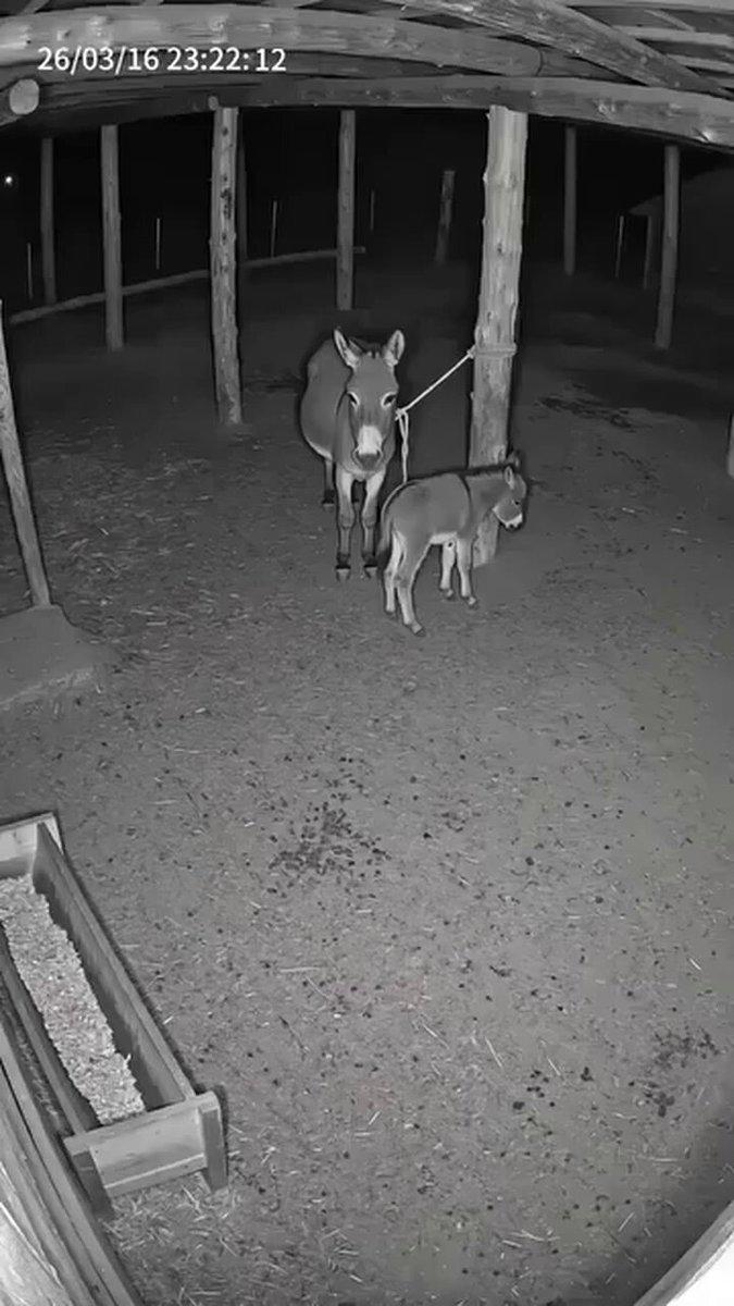Did a video show a mother donkey defend her foal from a fox attack and damage the barn in the process? No, that's not true: A content detection tool determined with 99.9 percent confidence that the video was AI generated. It was made to look like black-and-white CCTV footage filmed by a security camera.