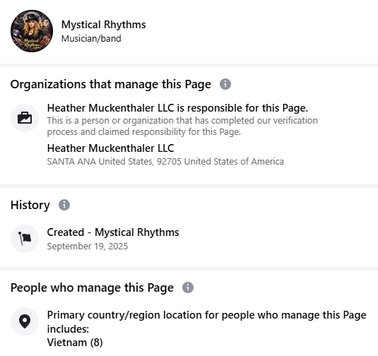 The Facebook page transparency report (archived here) for Mystical Rhythms (pictured below) shows the fan page has managers based in Vietnam.