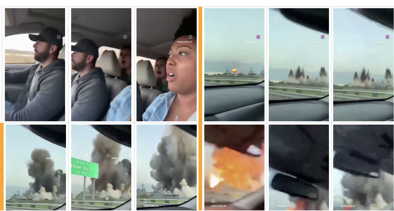 More importantly, the shots of the purported explosions did not include any missiles, contrary to news reports about the real strike on the U.S. naval base in Bahrain on February 28, 2026 (archived here). Instead, the video showed the fire starting on the ground: